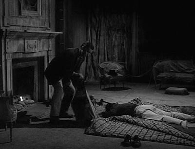 The boys investigate the old house, which appears deserted, though they call out to see if anyone is home. Though they are unaware, those of us in the audience see a door swing shut upstairs. Creepy! They enter a large drawing room and Tim suggests they get their sleeping bags and spend the night. His brother seems apprehensive, and Tim reminds him of the warning they received about snakes from a gas station attendant. His brother stays and looks closely at a portrait of a woman hanging over the fireplace.Night has fallen, but the pigeons are cooing and are giving Tim's bro the heebie-jeebies. The boys snuggle up in their sleeping bags and drift off to sleep. Some time later, Tim's brother awakens and we hear the sound of a woman's eerie vocalizing as the coos of the pigeons become louder, and he ascends the stairs toward the sound. Tim wakes up and sees that he is gone and gets up to look for him when he hears his anguished, terrifying cry. If that wasn't enough to scare the daylights out of kids in 1961, then what follows surely caused them to wait until the commercial break to change their wet pants.